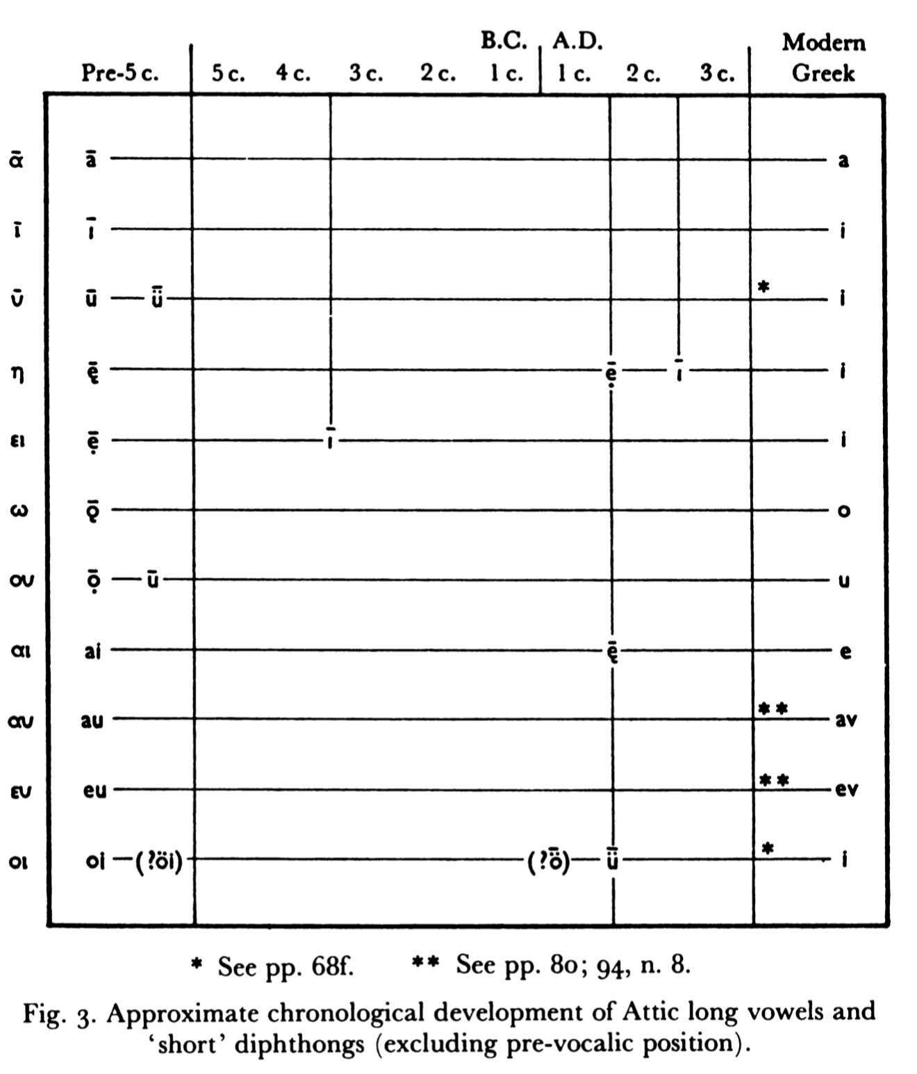 Tutte le informazioni risultano, così, completamente e direttamente disponibili (pag. 70-76 e pag. 83,84, in cui l'autore scrive che: "These developments are most easily understood if one assumes that in the classical period ει before vowels, unlike before consonants (see p. 71), stands for [eyy], 61 in which only later does the [ey] portion develop to monophthongal [ẹ̅] (with the second [y] then becoming an automatic glide)."
